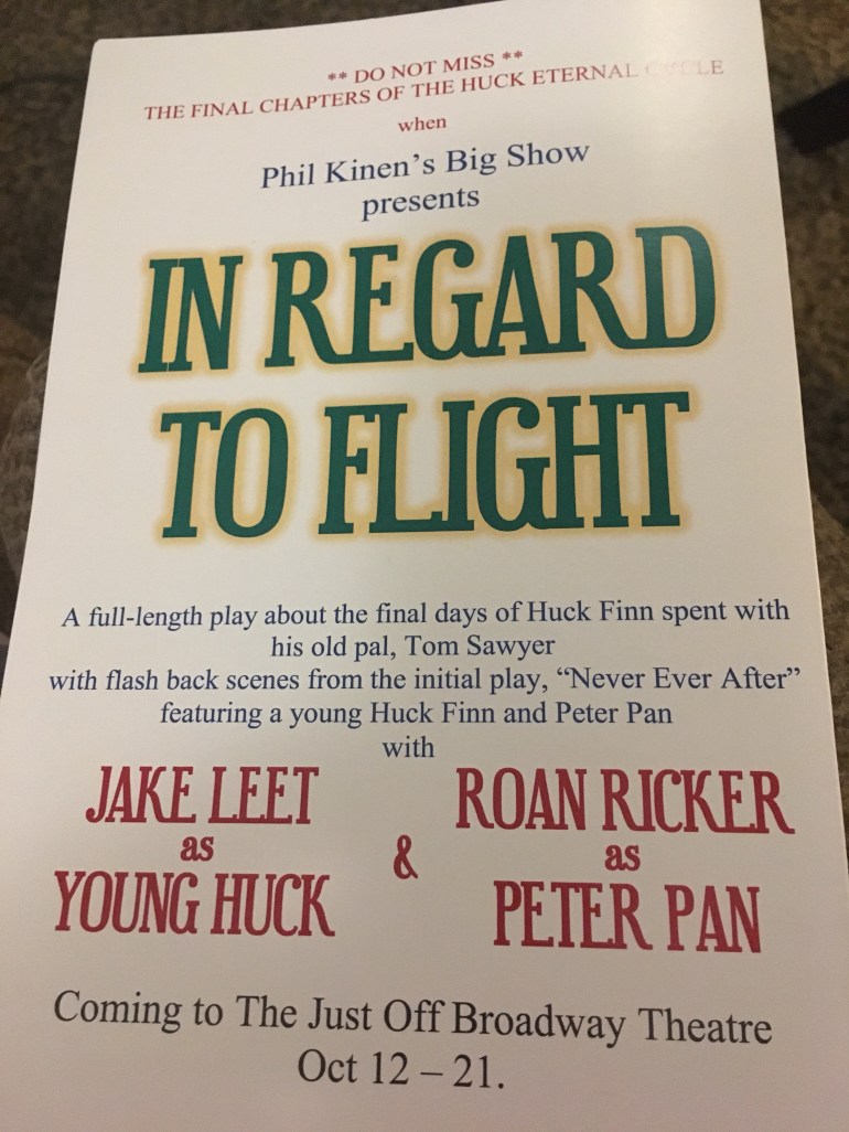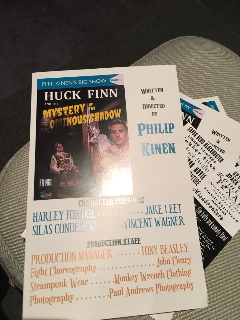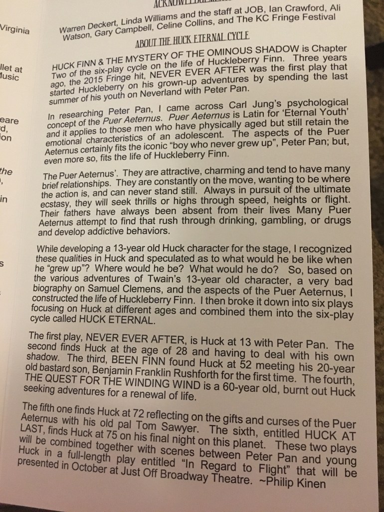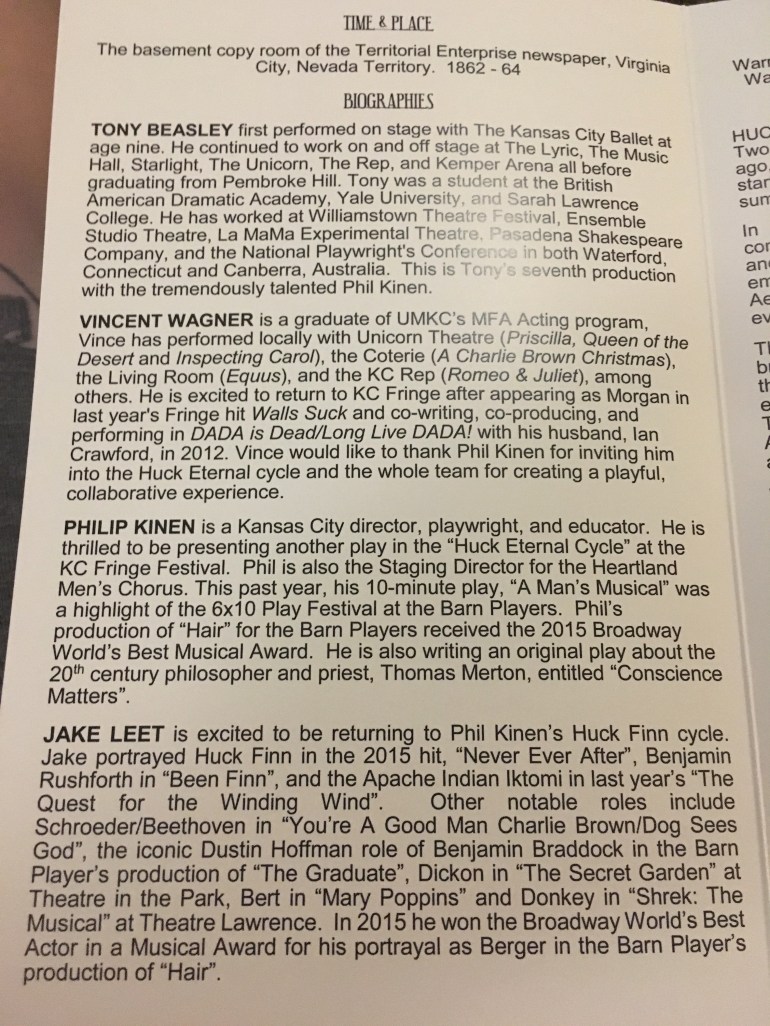 Phil Kinen and his Huck Finn cycle have gotten a lot of buzz from the KC FRINGE festival, and I finally got a chance to see why. Phil has created an amazing world where Huck Finn, rather than the creation of another author, is his own person, and is desperately trying to forget his old ways to become more sophisticated and educated. He is moving forward in his life after trying to leave his uneducated self behind, but uses his stories from childhood to gather money when he needs it. On top of this, he is now faced with working with a rival, Silas Condesent, who turns out to be more than he is just on the surface, who pulls Huck Finn / Harley Fordge to reveal more about himself. Fordge and Condesent’s relationship is delightfully complicated and volatile throughout the work.