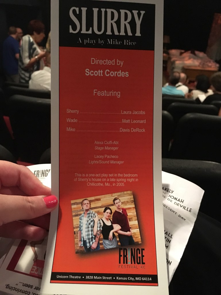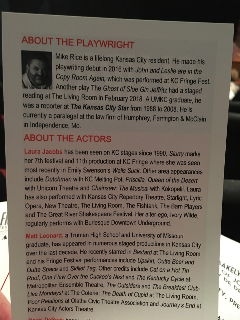 I think Mike Rice’s work is incredibly polished and the show actually needs a longer running time to allow the characters to move through their story lines, as there are some arcs missing in this particular rendition of his work. There is a lot here, and what was in the Fringe production was extremely well made, but I got the sense there were items I either was missing (due to not hearing them) or were actually left out. So often, the worlds we see on stage are urban centric, so it was wonderful to see a play that walked through so much of the politics of factory working and blue color circles, and I would love to see more of it. I hope in the future Slurry is given the chance for a longer run time for additional character development. There is something really great here, it just needs some more room to breathe (pun intended).