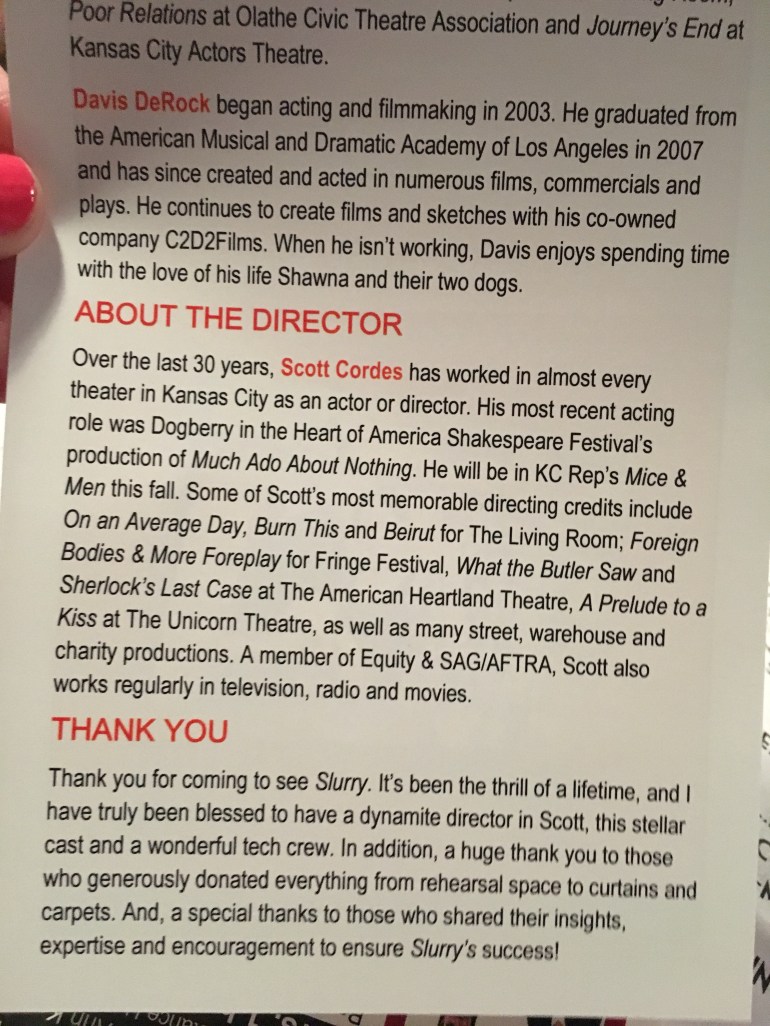 Long review: Having worked in factories for two different periods in my life, the play resonated in the dangers and hazards that can face you when working around chemicals over long periods of time. Wade (Matt Leonard) arrives to visit Sherry (Laura Jacobs) on the day he is certain he and other coworkers have been diagnosed with an unnamed lung disease from working with slurry at a candy factory. Wade brings this information to Sherry, his ex girlfriend, before anyone else, lamenting the fact that he lost her, the only good thing he ever had. The story walks through the politics of the plant, the favoritism, and the relationships, and ends with Mike (Davis DeRock), arriving home to find Sherry rebuffing Wade from a sexual advance.