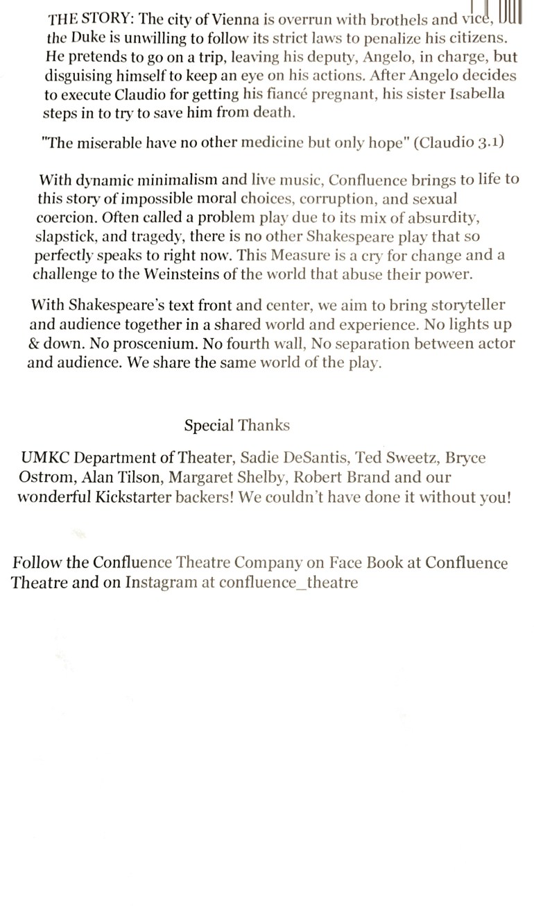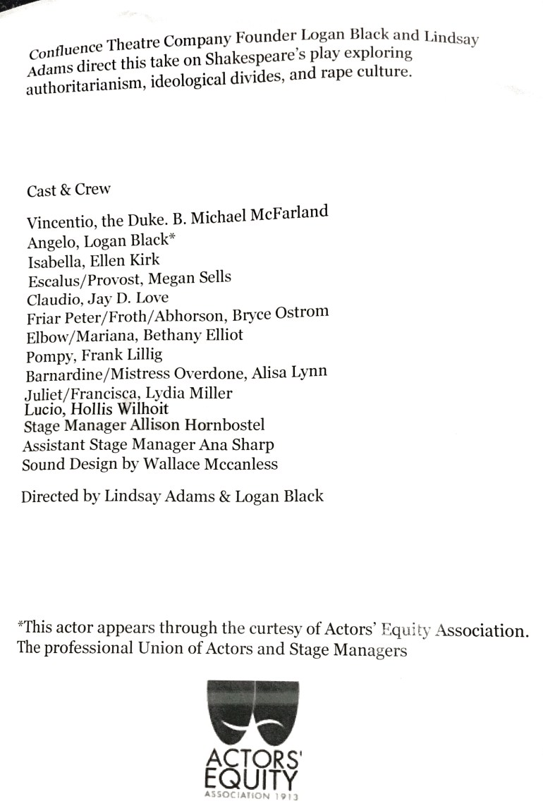 Measure for Measure is Confluence Theatre Company’s inaugural work and what an auspicious beginning. Performed in modern, styled clothing, with American accents, quick pacing, live music and audience interaction it was a delight to watch and listen to. Based on this first show, I can’t wait for what this company does next.