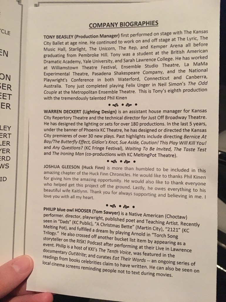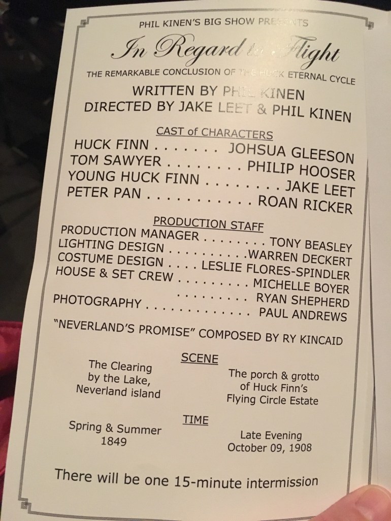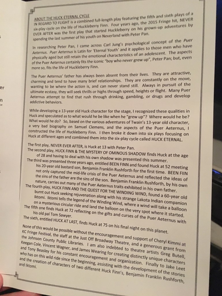 I absolutely love Phil Kinen’s writing and this play is a fantastic example. His work is lyrical and invokes the time period, and every character voice is crysal clear. In Regard To Flight, Kinen drops the audience in the middle of a fanastical story of youth, love, loss, old age, and memory. It was a small, but very engaged, house. During intermission, I overheard members of the audience discuss the beauty of Phil’s Huck Eternal cycle and the desire to see a night of all of them, and one audience member mentioned In Regard To Flight was a great capstone. I have seen Huck Finn and the Mystery of the Ominous Shadow and my review can be found here.