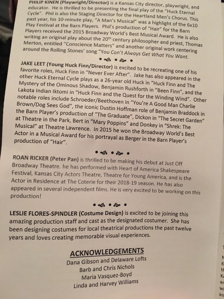 On the night of the play, Tom Sawyer is terminally ill and is trying to get Huck Finn to the the truth of his time in Neverland. Was Peter Pan a delusion? What was real? Did Huck actually fly? Was Huck’s son, now vanished, a figment of his imagination? This tug and pull between the two men ebb and flow between Huck’s time in Neverland. Monologues and blocking bleed into scenes from past to present, showing us how Huck’s time in Neverland kept him young at heart, and his relationship with Peter Pan still affects him. What makes this work unbelievably heartbreaking and beautiful is the universal truths of lost youth and innocence, regret, and fear. I have never seen a finer piece of acting or writing come together recently than in the speech about death given by Tom Sawyer (Philip Hooser). Perfection.