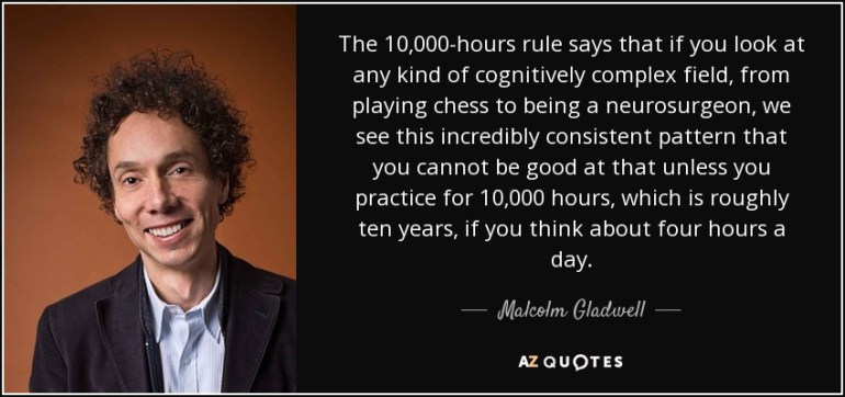 Malcolm Gladwell in his book Outliers, states that it takes 10,000 hours to be good at a thing.
