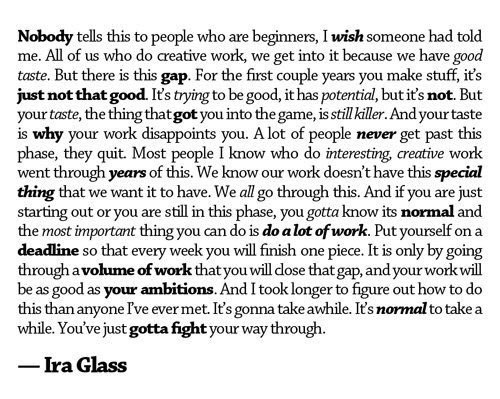 In these 10,000 hours we hold onto the hope that we will be accepted enough to hear glimmers of our voice. That’s why this quote by Ira Glass resonates (listen to it here: https://youtu.be/PbC4gqZGPSY)