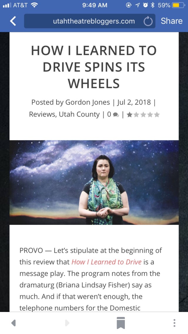 Utah Theatre Bloggers Sexist and Dangerous review on How I Learned to Drive July 4, 2018July 5, 2018